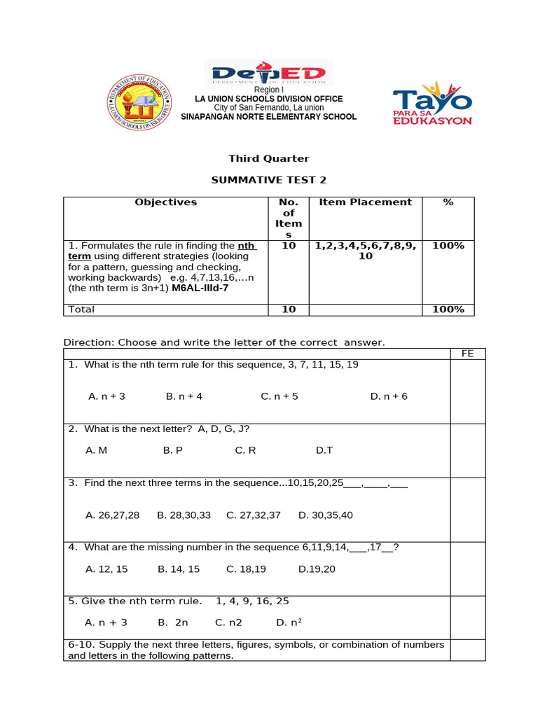 Summative Test # 2 Math 6 Third Quarter 2017 | PDF