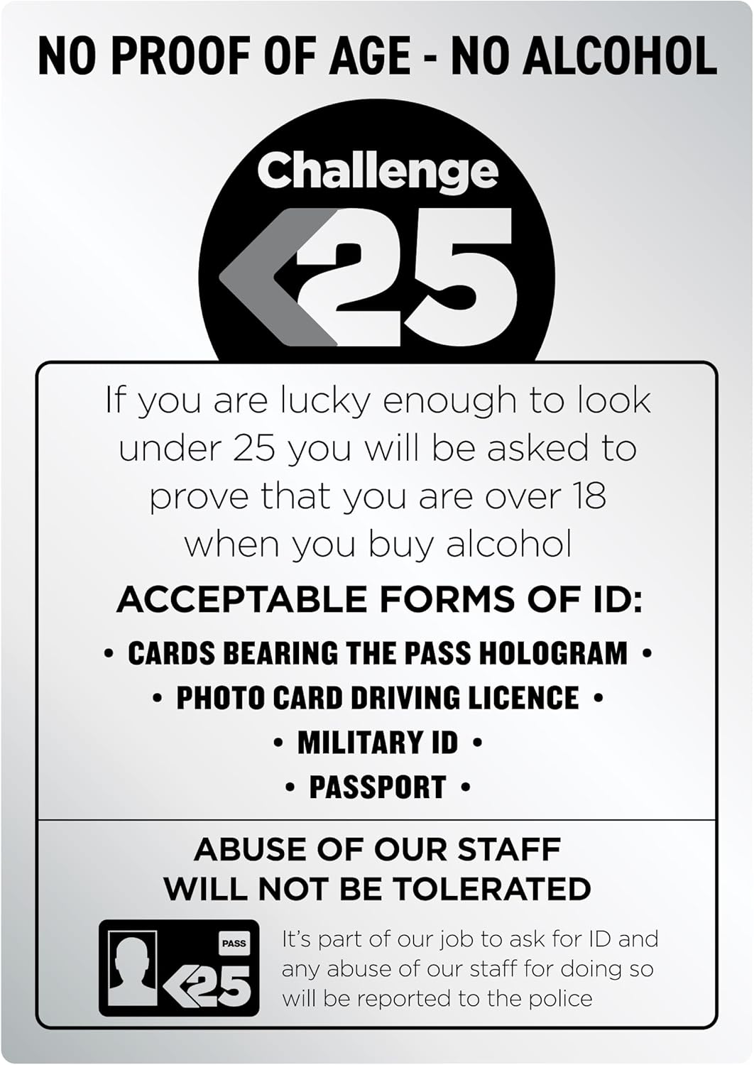 Challenge 25 Sign Silver A4 297 x 210mm Alcohol Law Sign Pub Bar ...