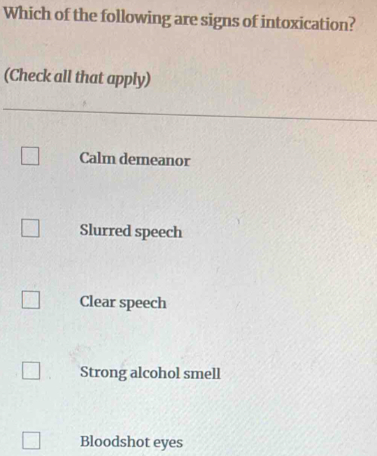 Solved: Which of the following are signs of intoxication? (Check all ...