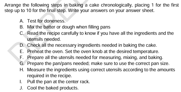 Solved: Arrange the following steps in baking a cake chronologically ...