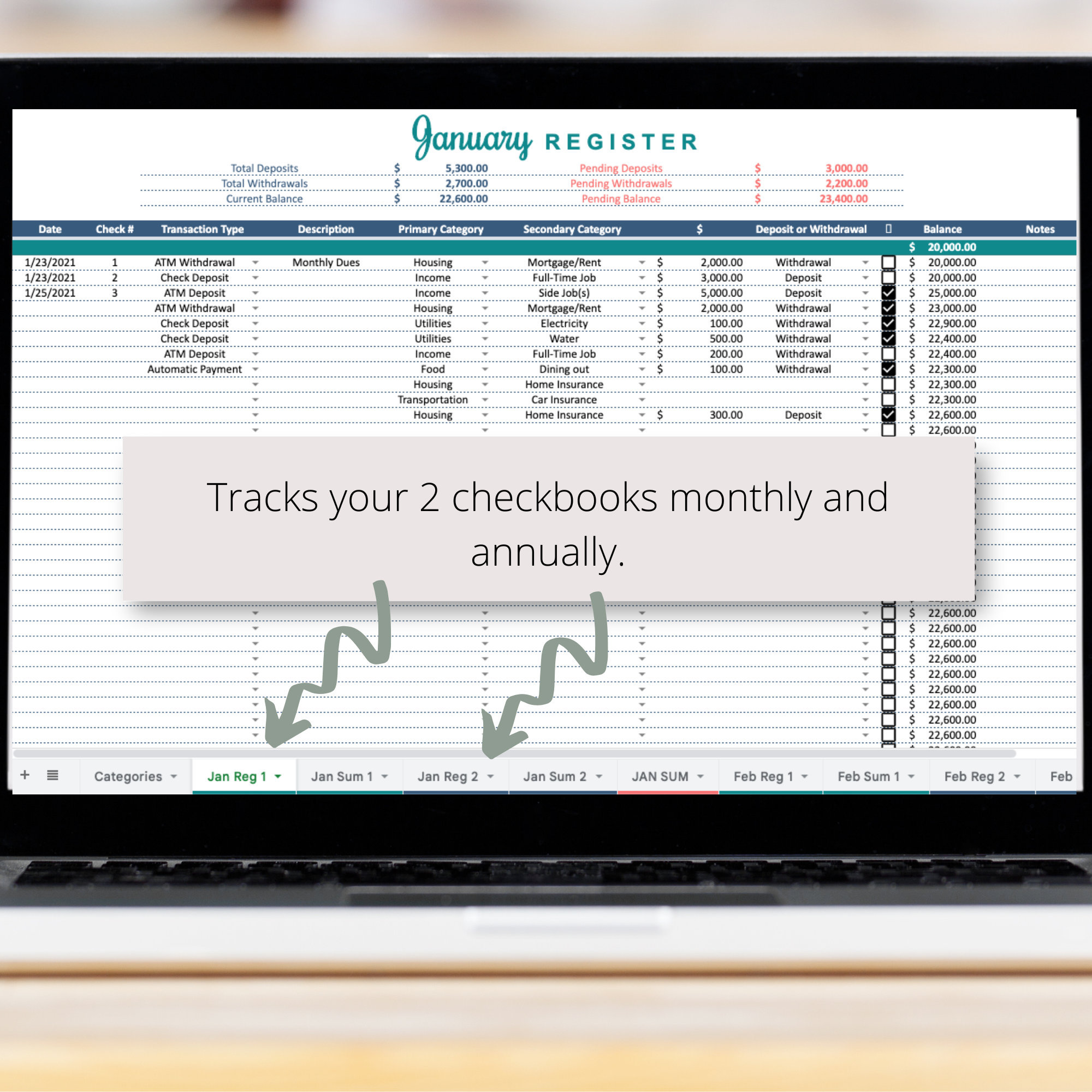 2 Checkbook Registers With Monthly and Annual Summaries Google Sheets ...