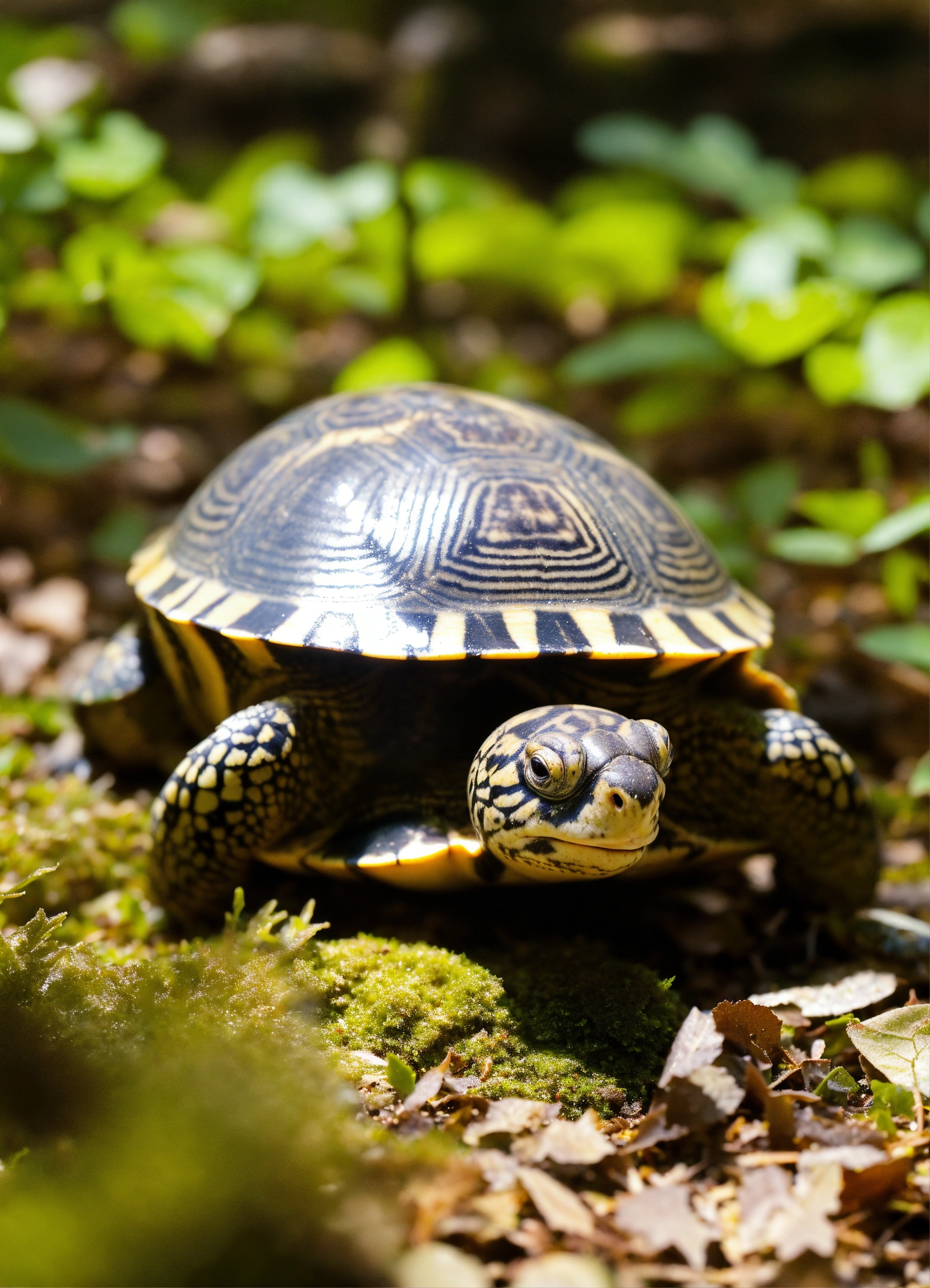 Lexica - A small terrapin with a checkerboard shell crawling in the forest.