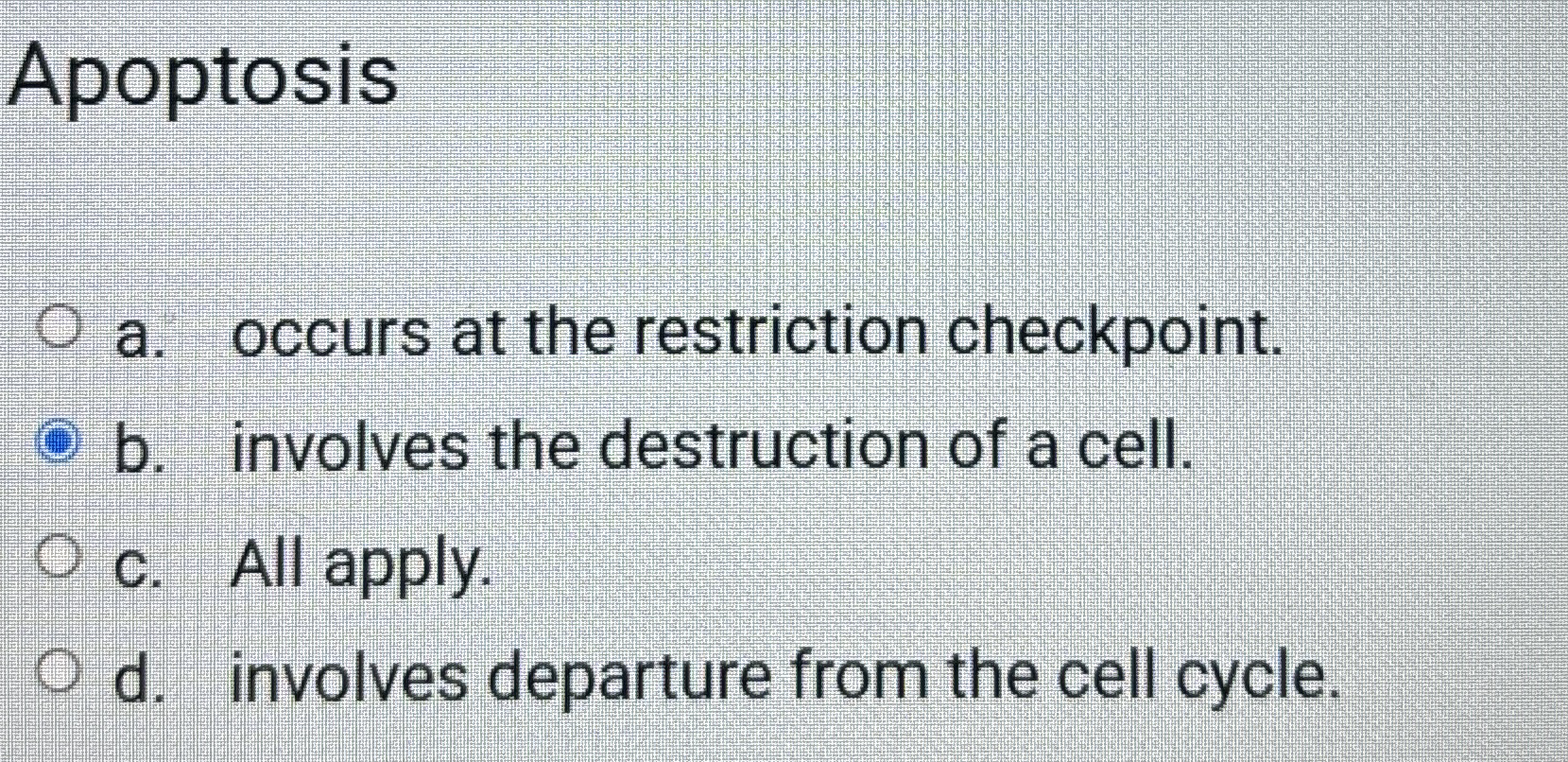 Solved Apoptosisa. occurs at the restriction checkpoint.b. | Chegg.com