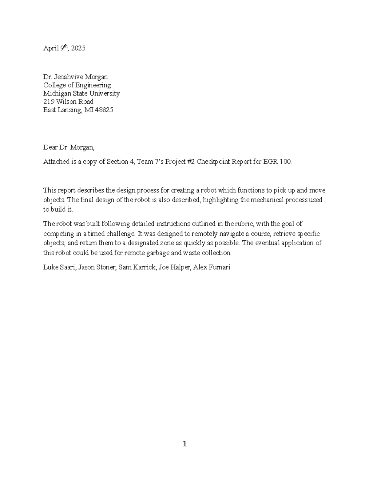 Team 7 Checkpoint (Robot Design) - April 9th, 2025 Dr. Jenahvive Morgan ...