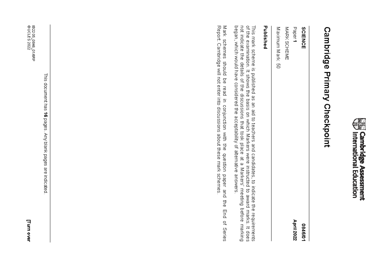 Cambridge Primary Checkpoint SCIENCE Paper 1 Mark Scheme - April 2022 ...