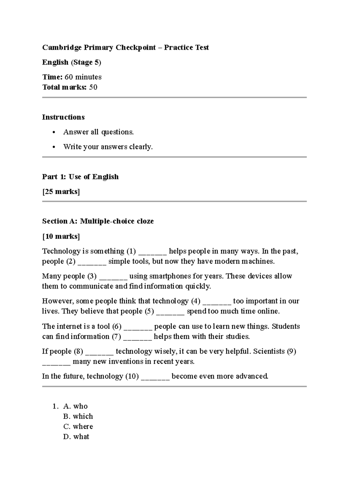 Cambridge Primary Checkpoint Practice Test: English Stage 5 - Studocu