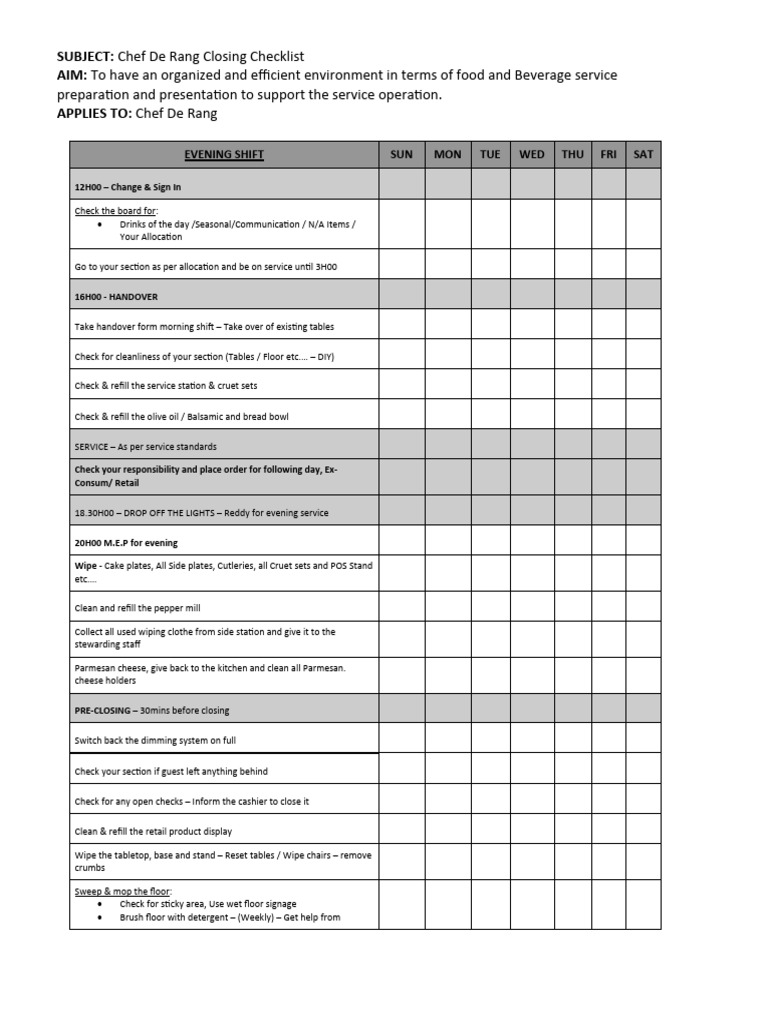 Chef de Rang Closing Checklist (AHH) 12.31.04 PM | PDF | Cooking, Food ...