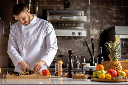 Professional cook chef preparing meat in the kitchen culinary concept ...