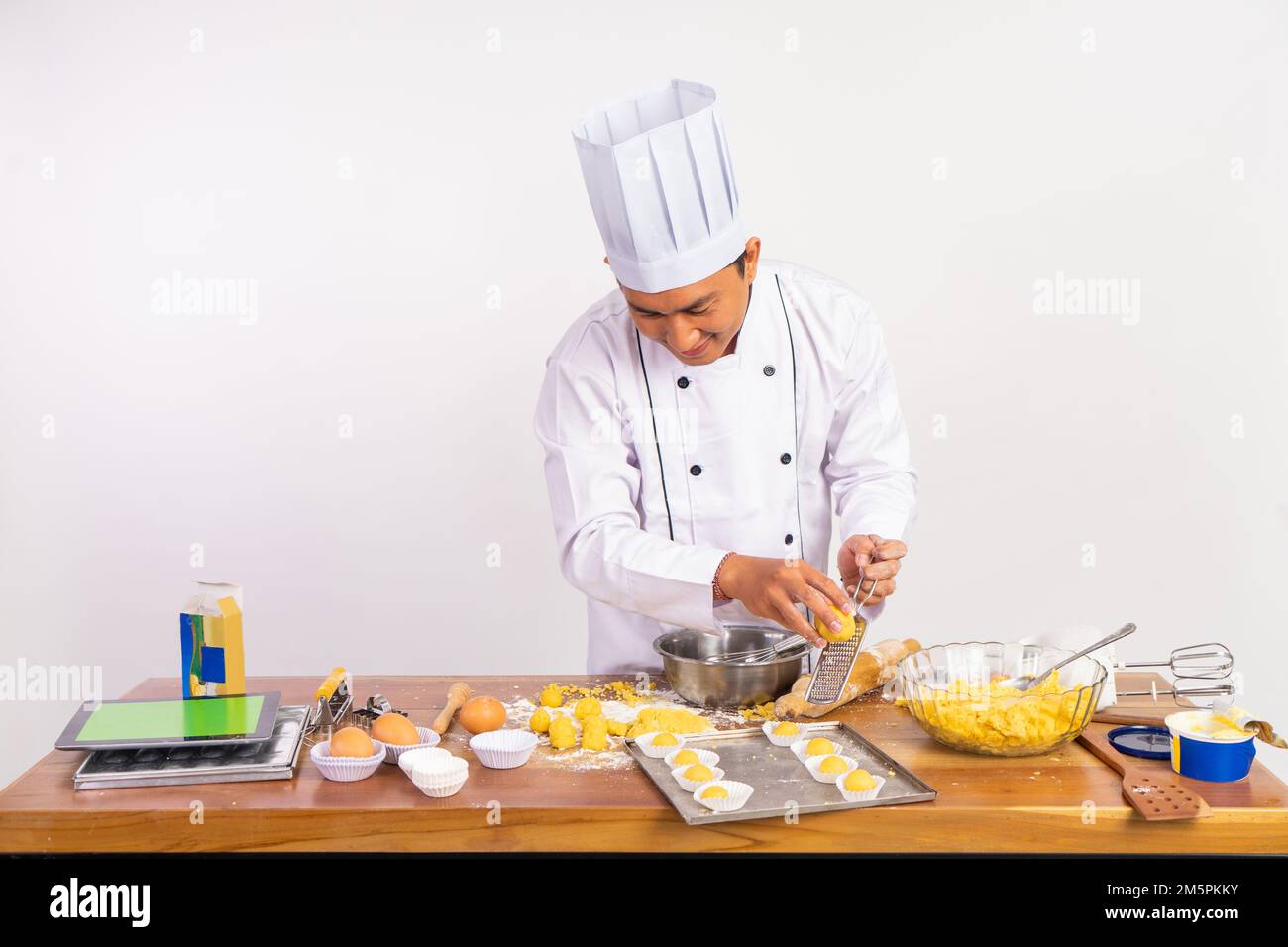 chef isolated on white background, cuts cheese Stock Photo - Alamy