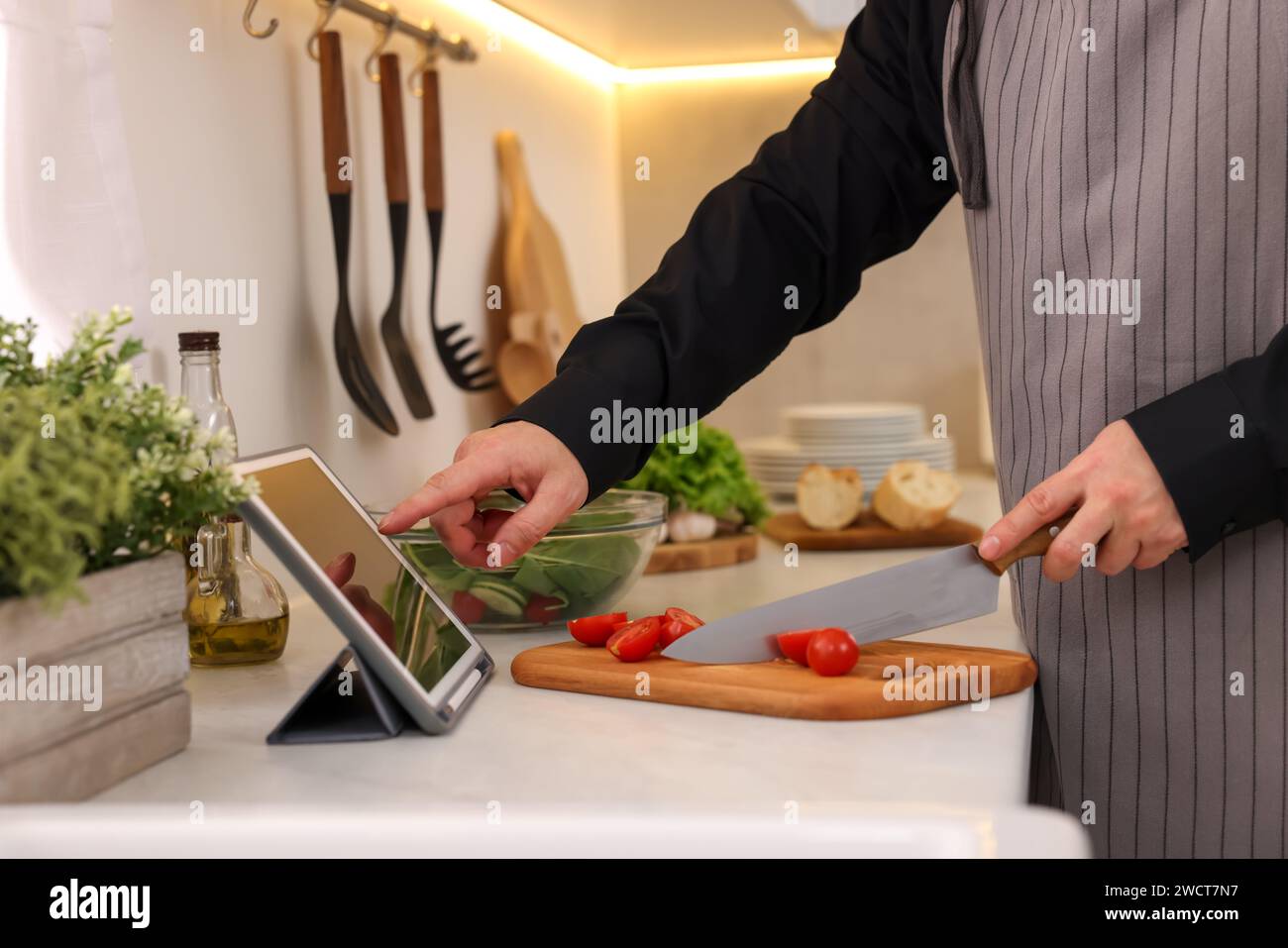 Man using tablet while cooking at countertop in kitchen, closeup Stock ...
