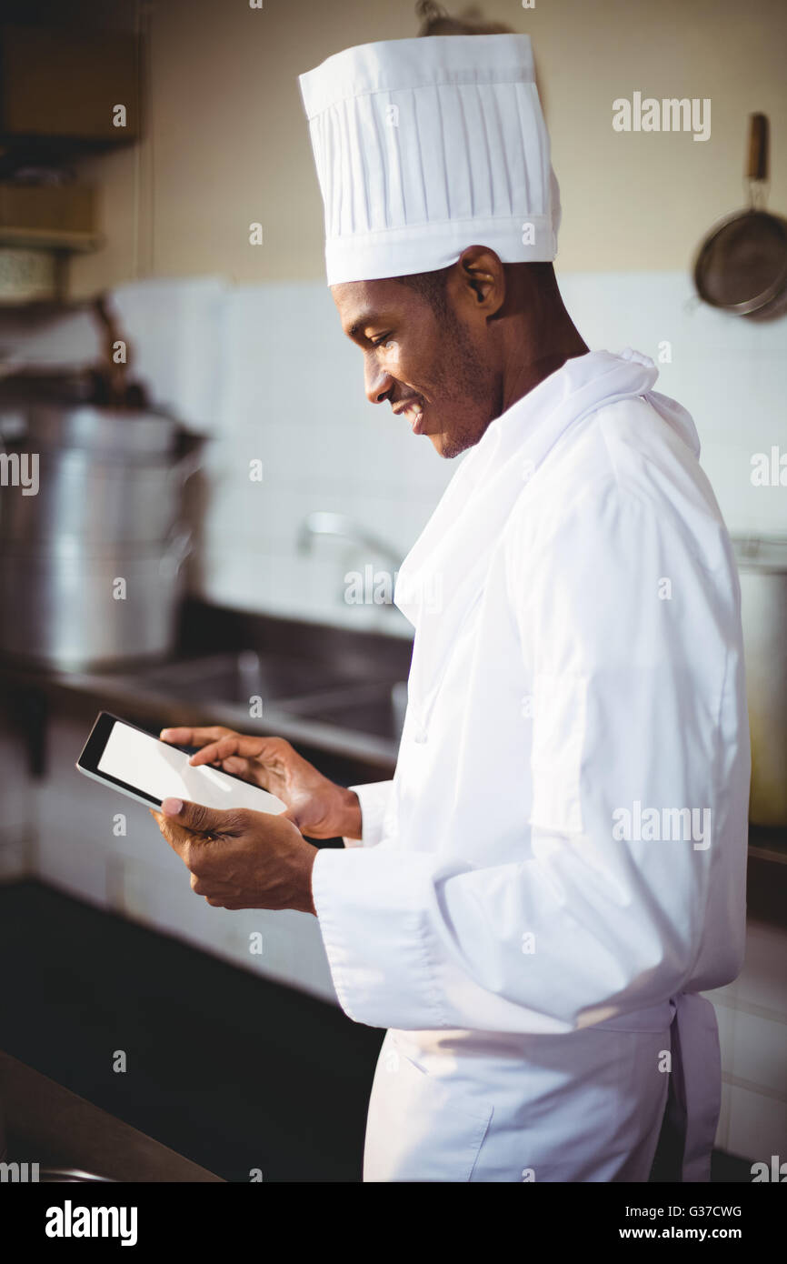 Professional cook in kichen using digital tablet Stock Photo - Alamy