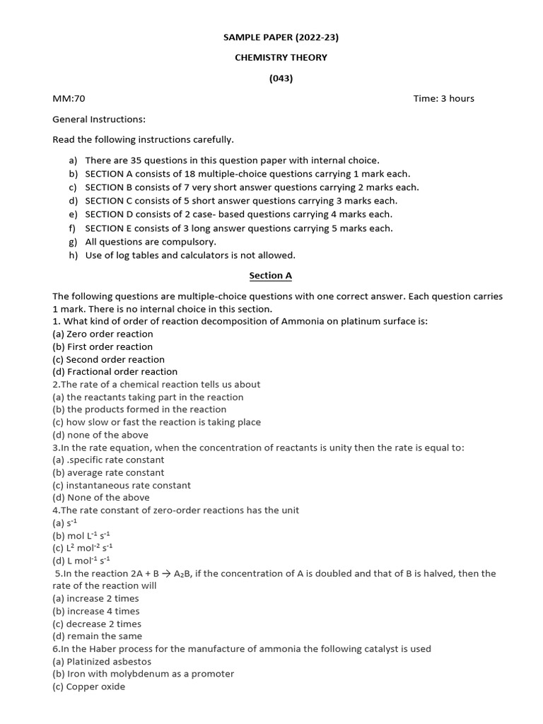 Sample Paper Chemistry 2025 12th | PDF | Ammonia | Physical Sciences