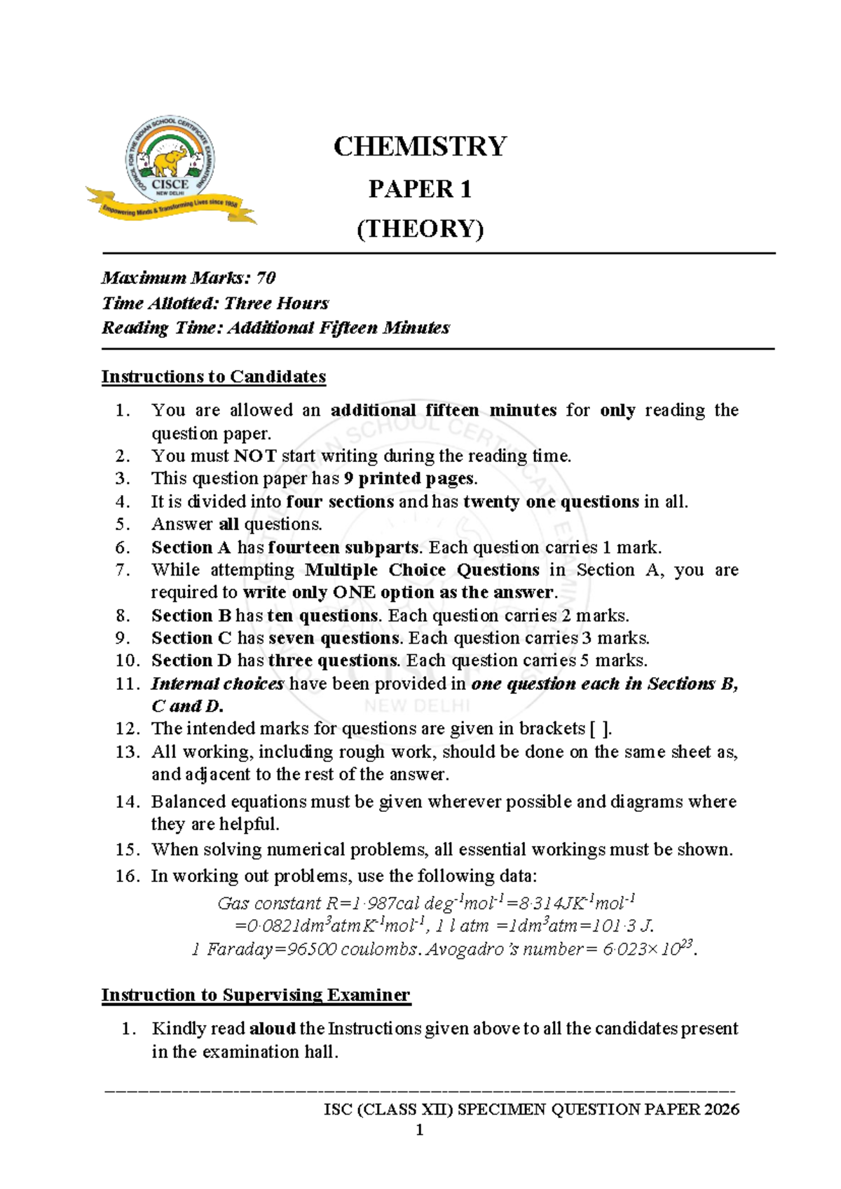 CHEMISTRY PAPER 1 (THEORY) SPECIMEN QUESTION PAPER 2026 - Studocu