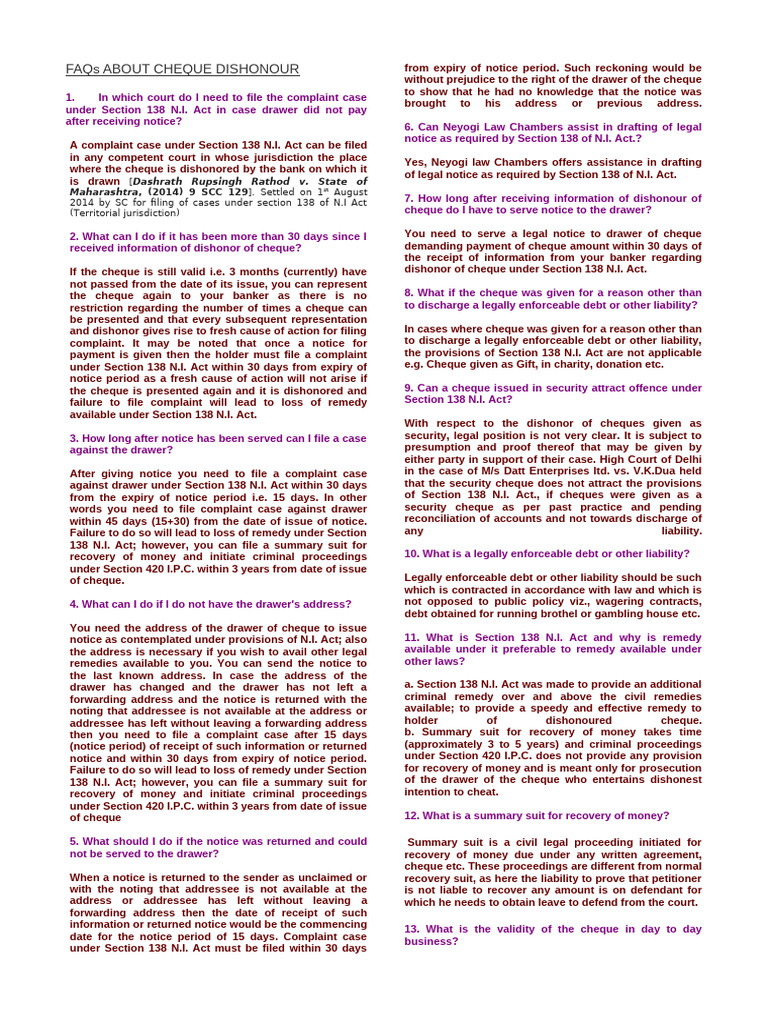 FAQs ON CHEQUE BOUNCE CASES | PDF | Cheque | Negotiable Instrument
