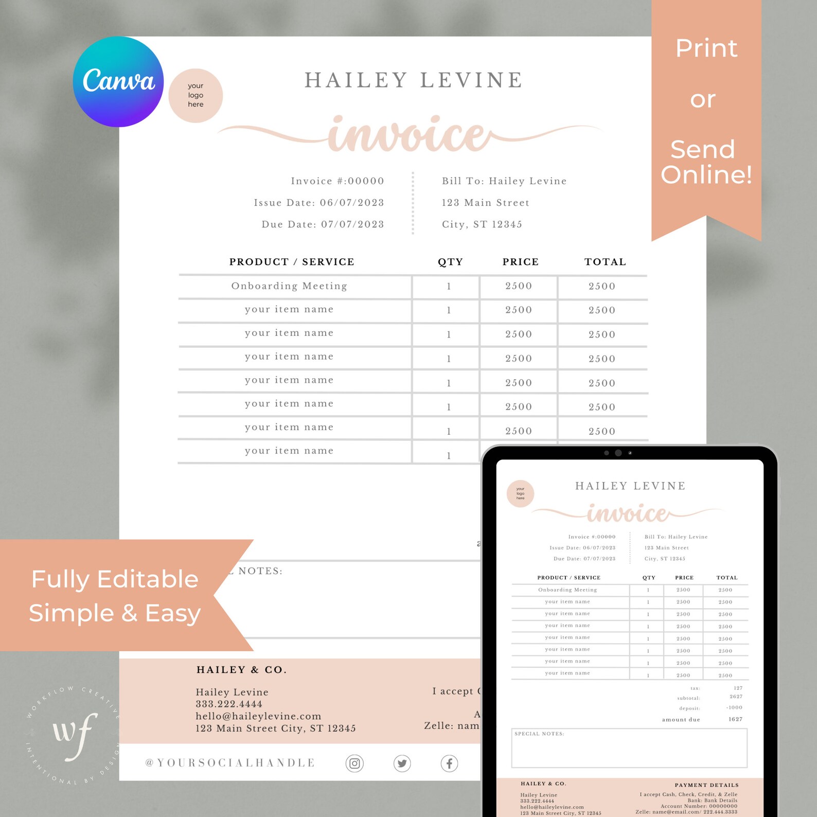 Invoice Template Editable for Small Business, Minimalist Canva Excel ...
