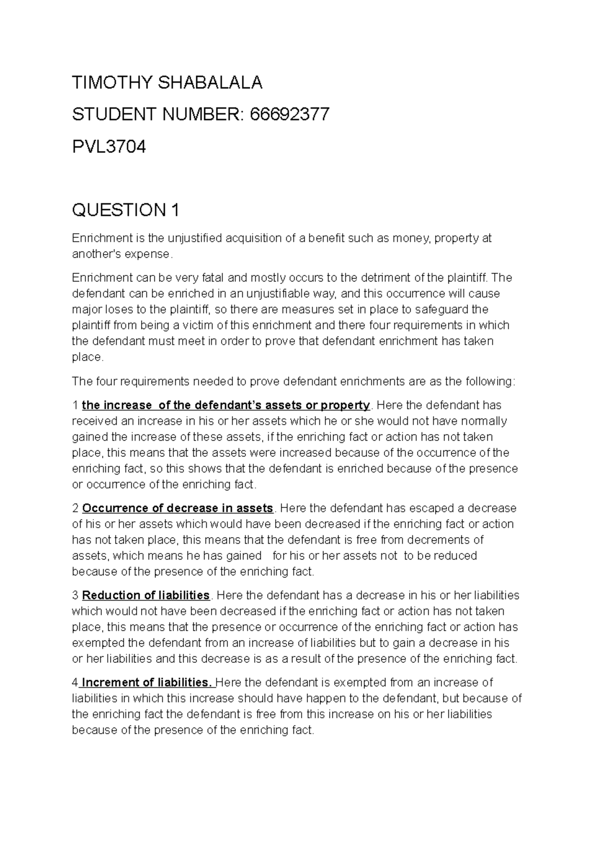 PVL3704 Assignment 1: Understanding Unjust Enrichment Principles - Studocu