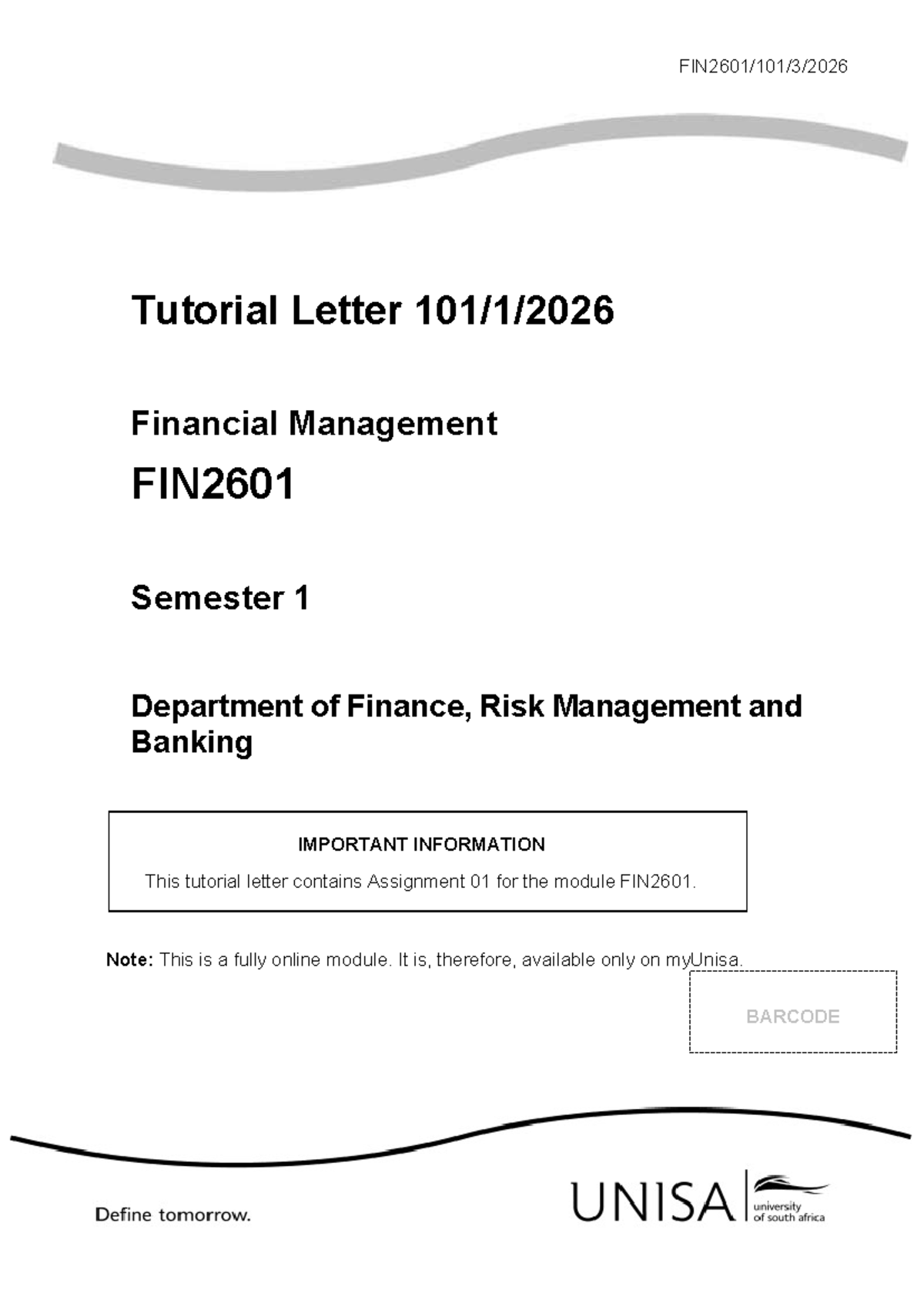 Tutorial Letter: Financial Management Assignment 01 - FIN2601 S1 - Studocu