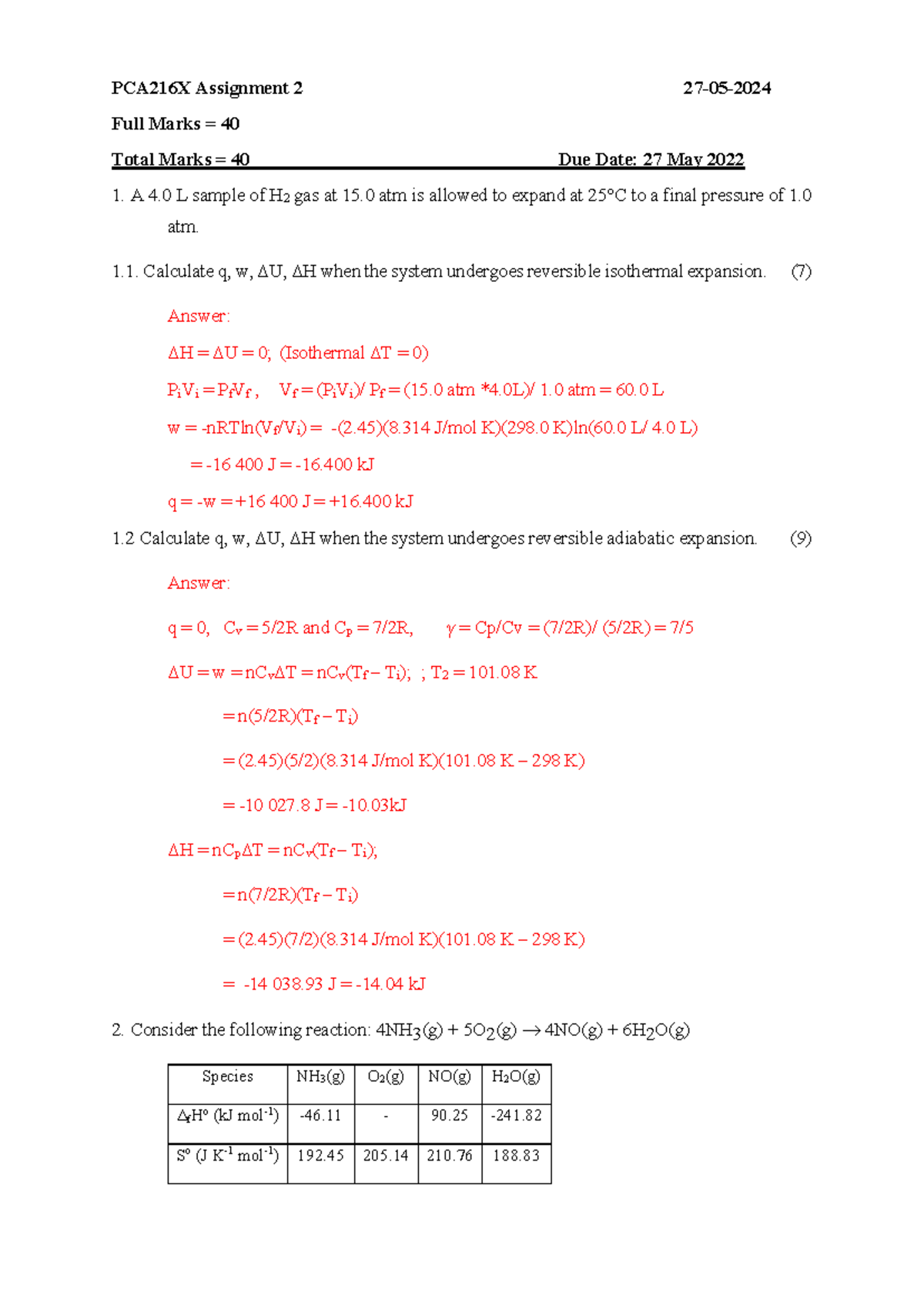 PCA216X Assignment 2 2024A Memo: Thermodynamics & Reactions - Studocu