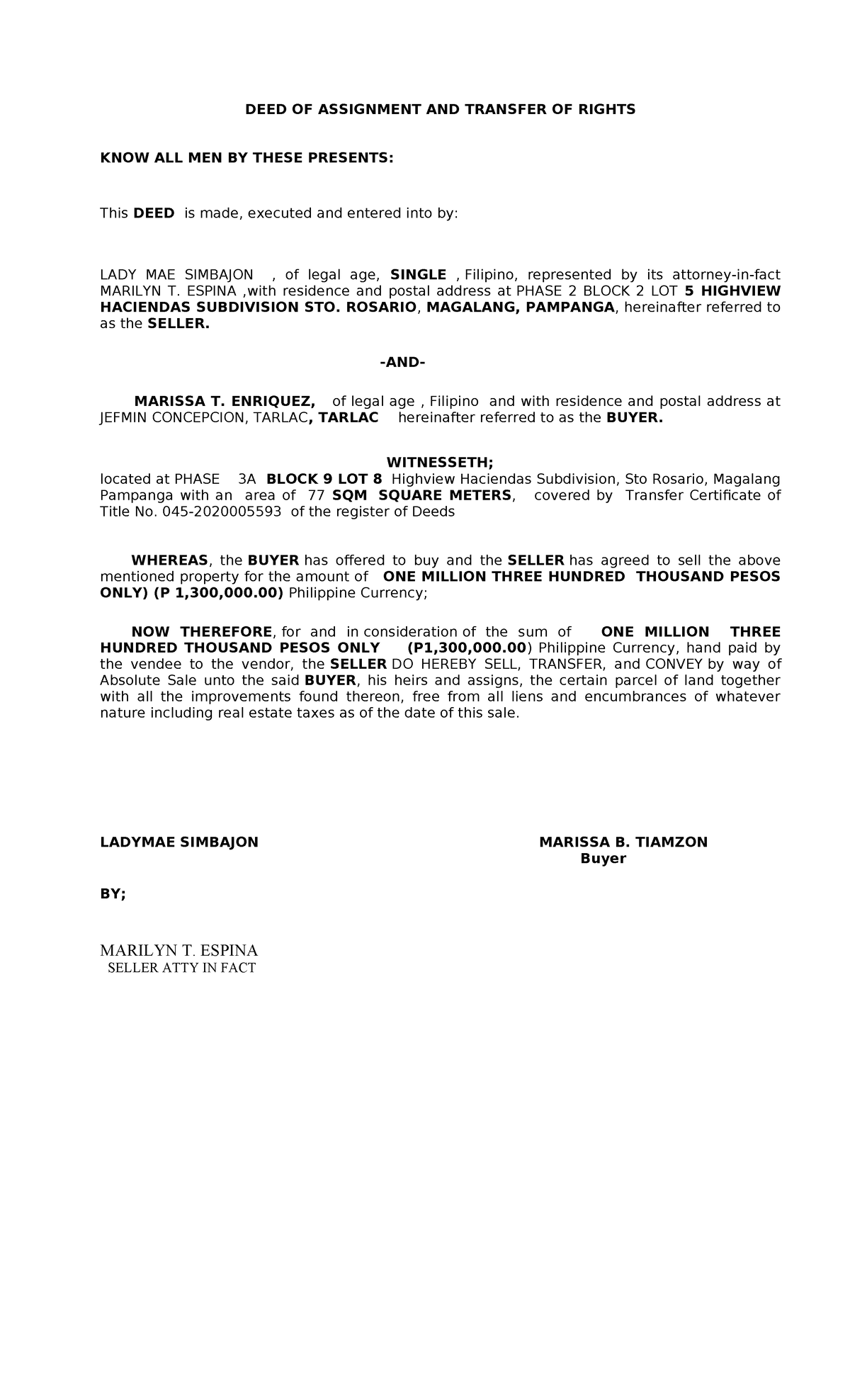 DEED OF ASSIGNMENT AND TRANSFER OF RIGHTS: LADY MAE SIMBAJON - Studocu
