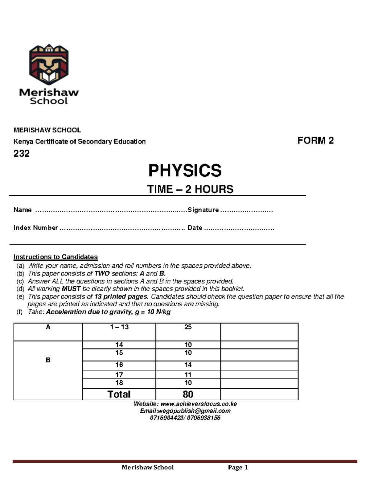 Physics Holiday Assignment - KCSE 232 - Studocu