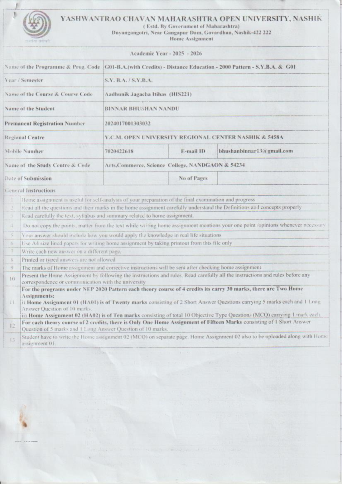 Home Assignment for Aadhunik Jagacha Itihas (HIS221) - AY 2025-2026 ...