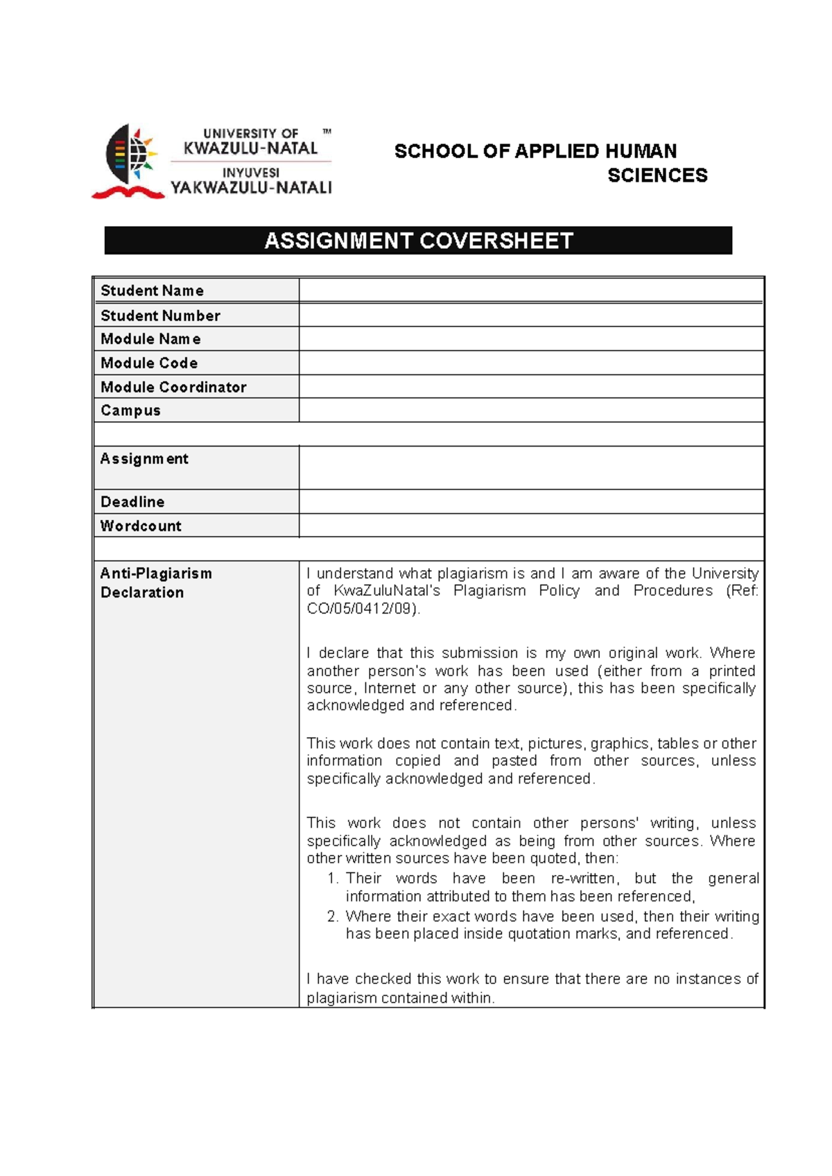 SCHOOL OF APPLIED HUMAN SCIENCES ASSIGNMENT COVER PAGE - Studocu