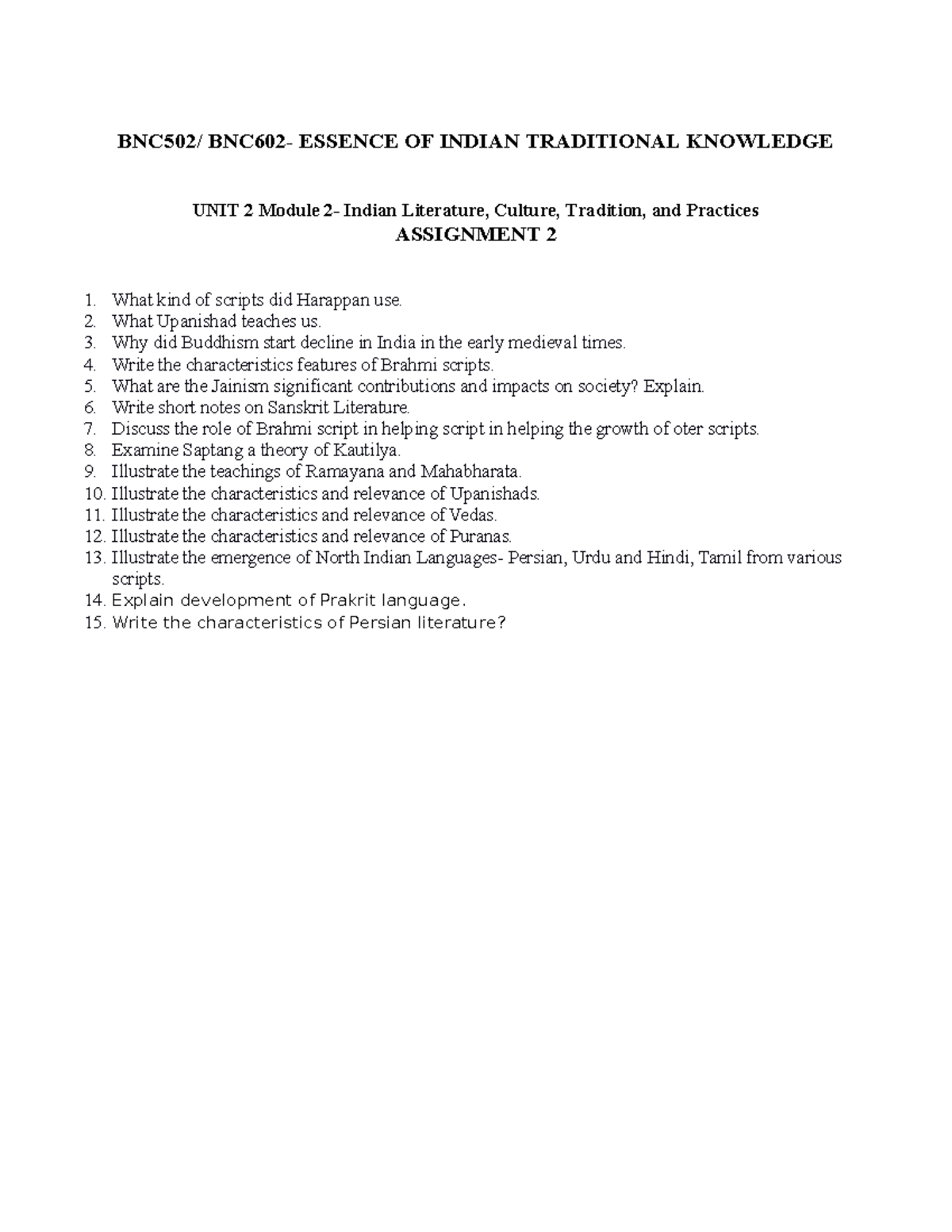 ITCS Assignment 2: Indian Literature, Culture, and Traditions - Studocu