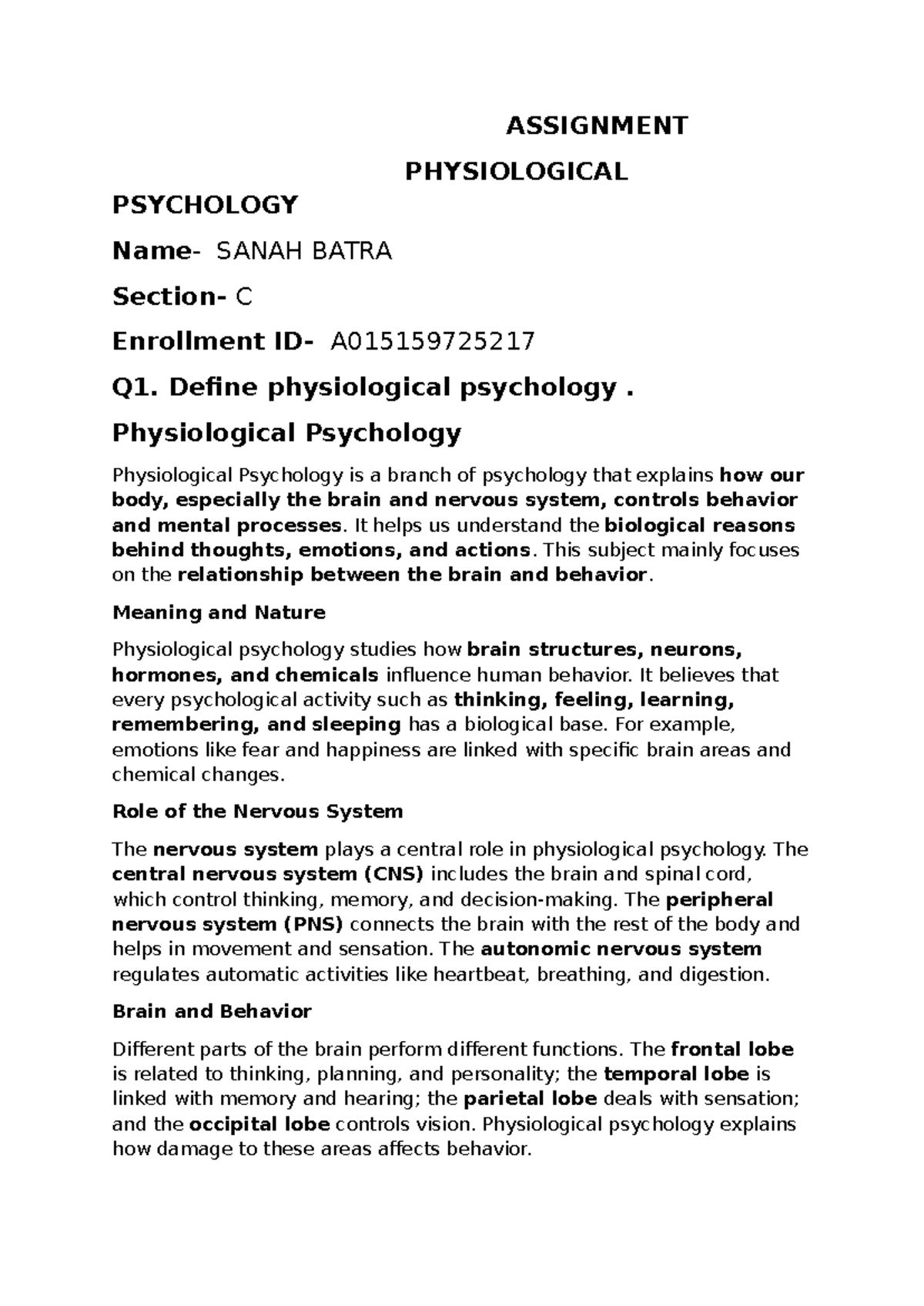 Physiological Psychology Assignment - Sanah Batra (A015159725217) - Studocu