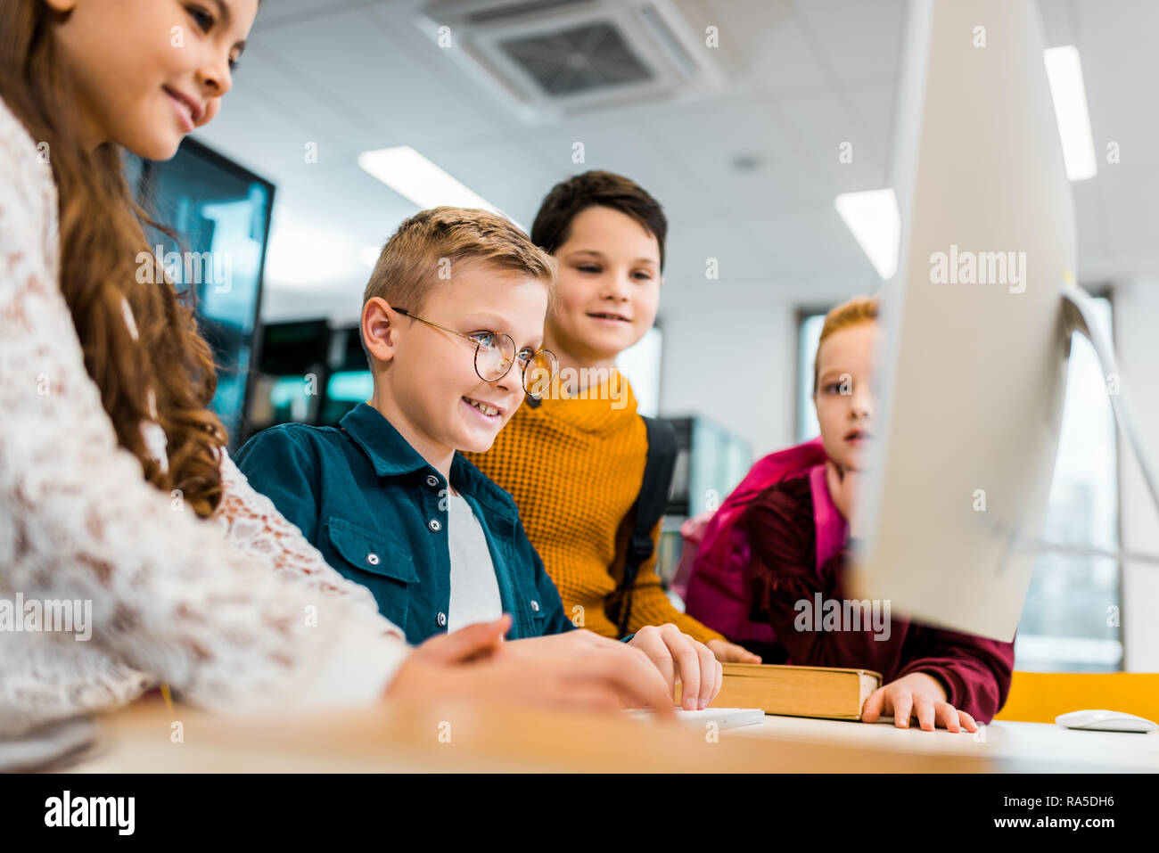 CHILDREN AROUND COMPUTERS IN SCHOOL LIBRARY Stock Photo - Alamy