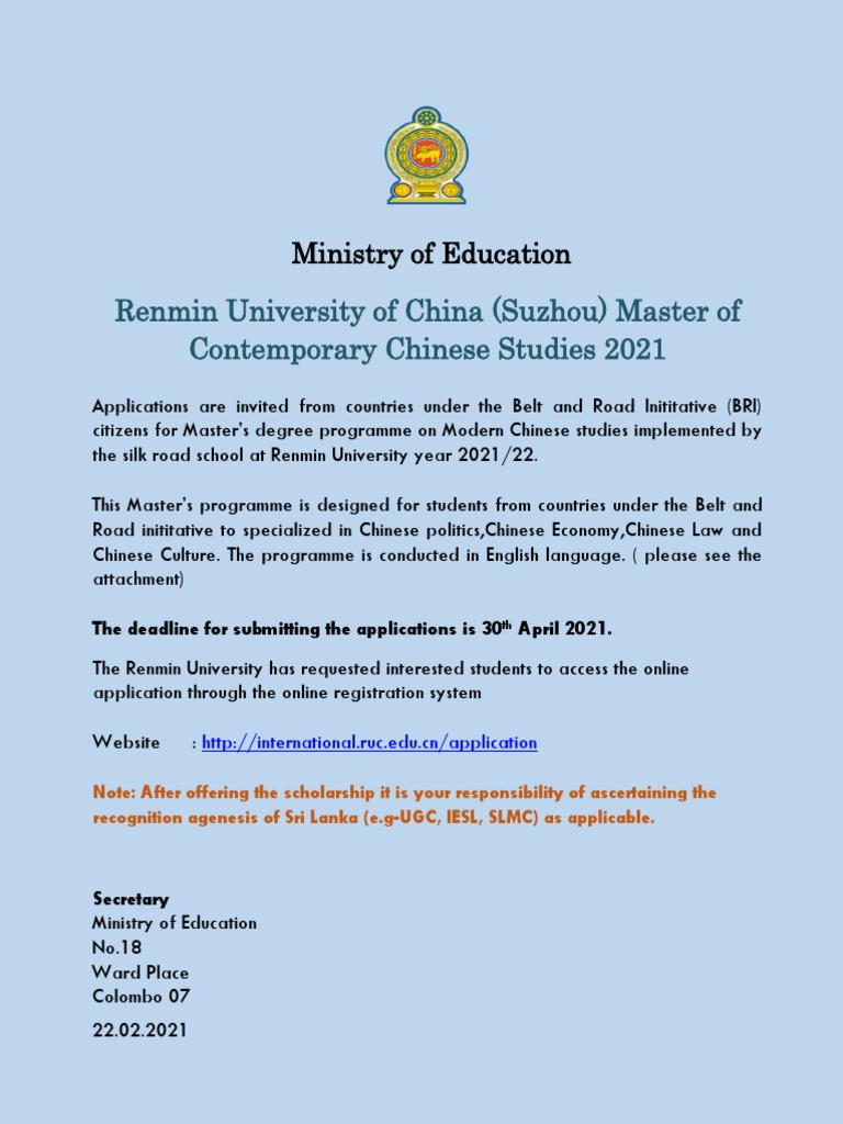 Master degree program of Contemporary Chinese Studies 2019 - Gazette.lk