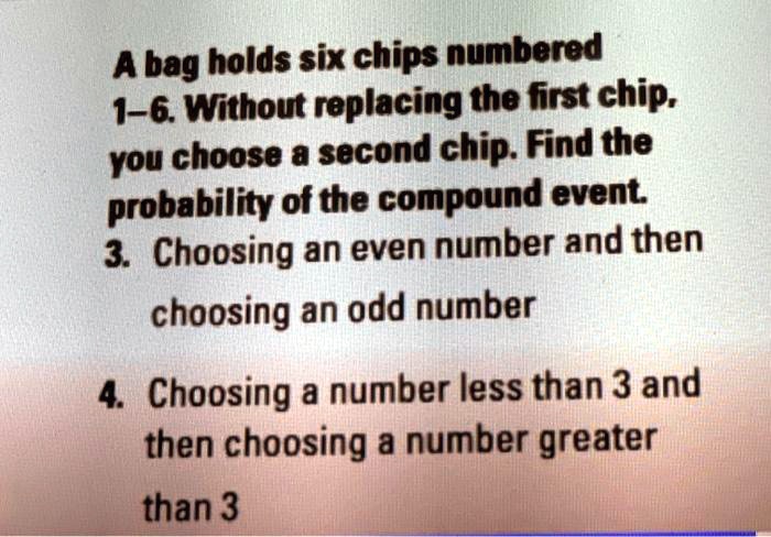 SOLVED: A bag holds six chips numbered 1-6. Without replacing the first ...