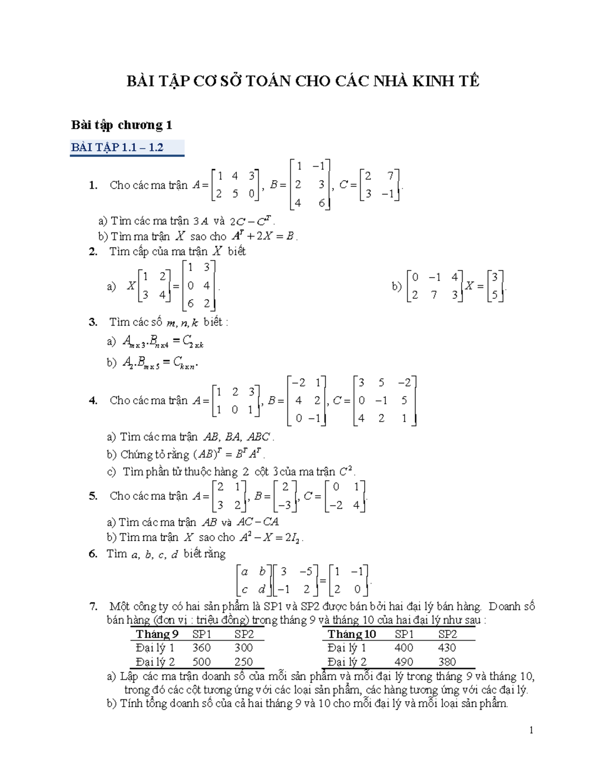 BÀI TẬP CƠ SỞ TOÁN CHO CÁC NHÀ KINH TẾ - CHƯƠNG 1 - Studocu
