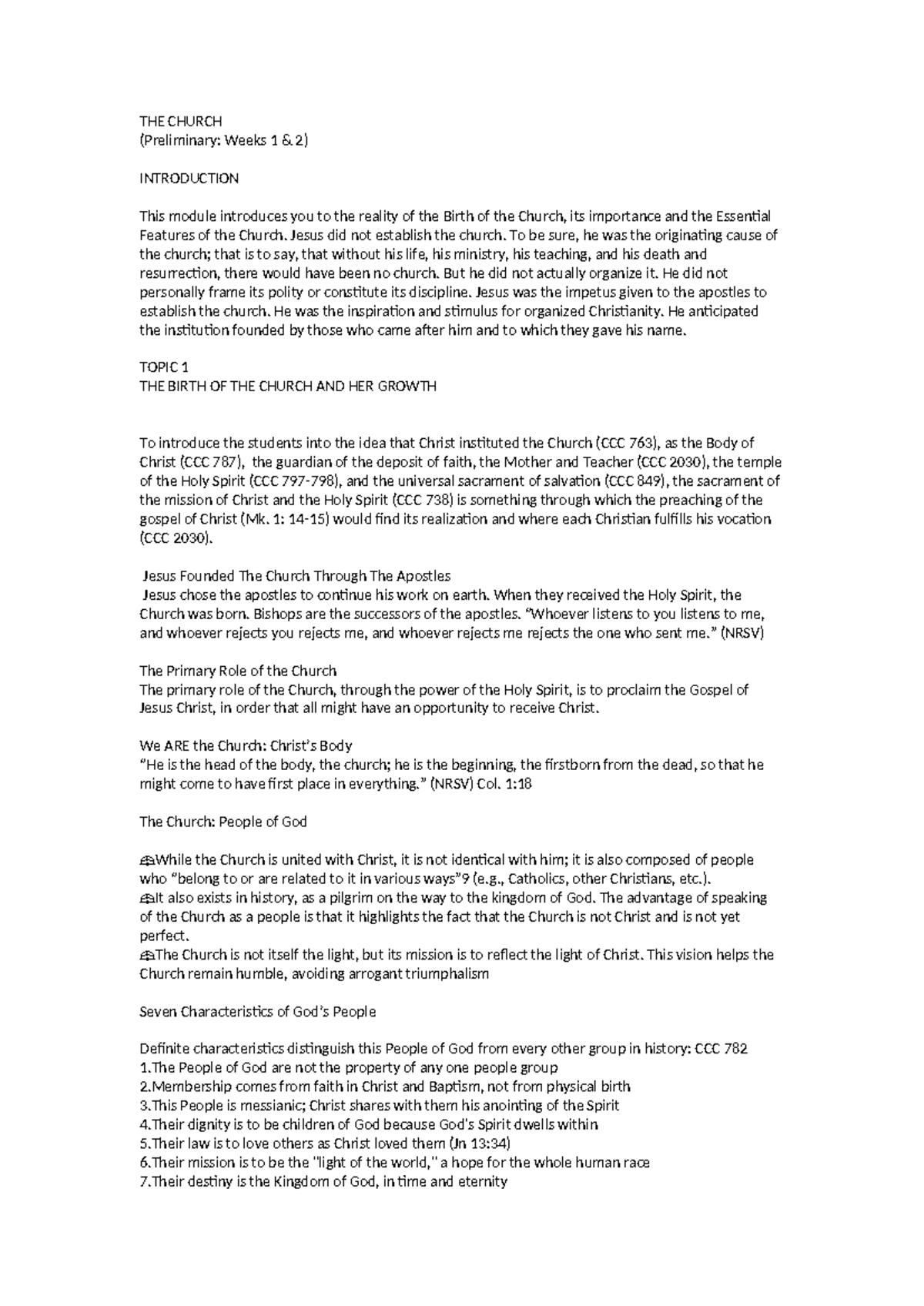 RE 2 Preliminary Notes: The Birth and Role of the Church - Studocu