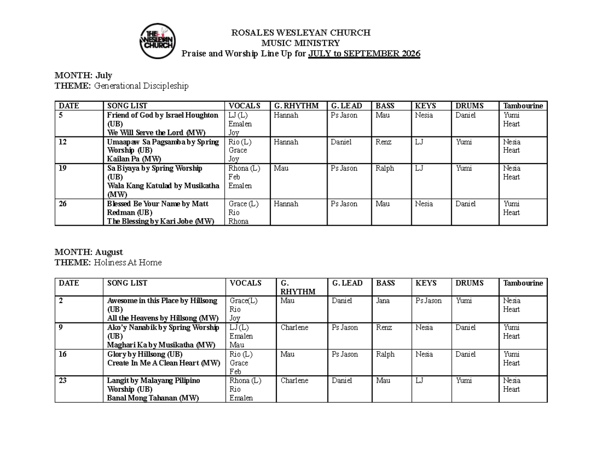 ROSAL WESLEYAN CHURCH MUSIC MINISTRY Line-Up JULY to SEPT 2026 - Studocu