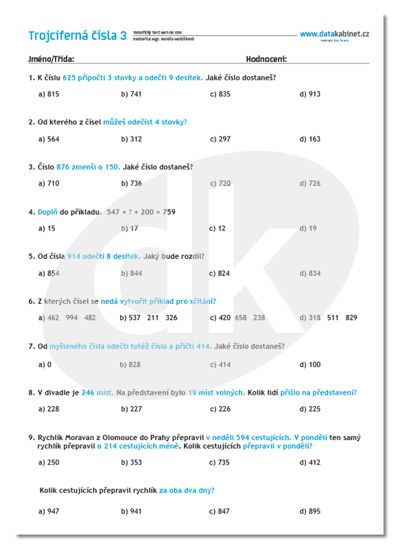 Trojciferná čísla 3 - test | datakabinet.cz
