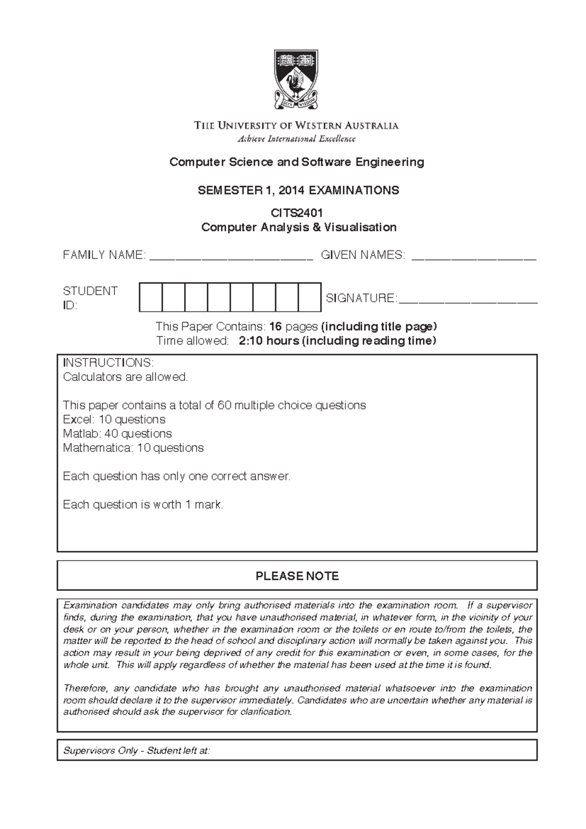 Computer Science CITS 1st Sem 2014 Exam - Analysis & Visualisation ...