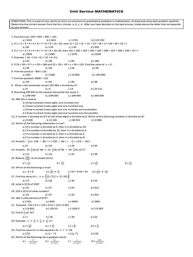 15 items Civil Service Exam Related MATH Questions with detailed ...