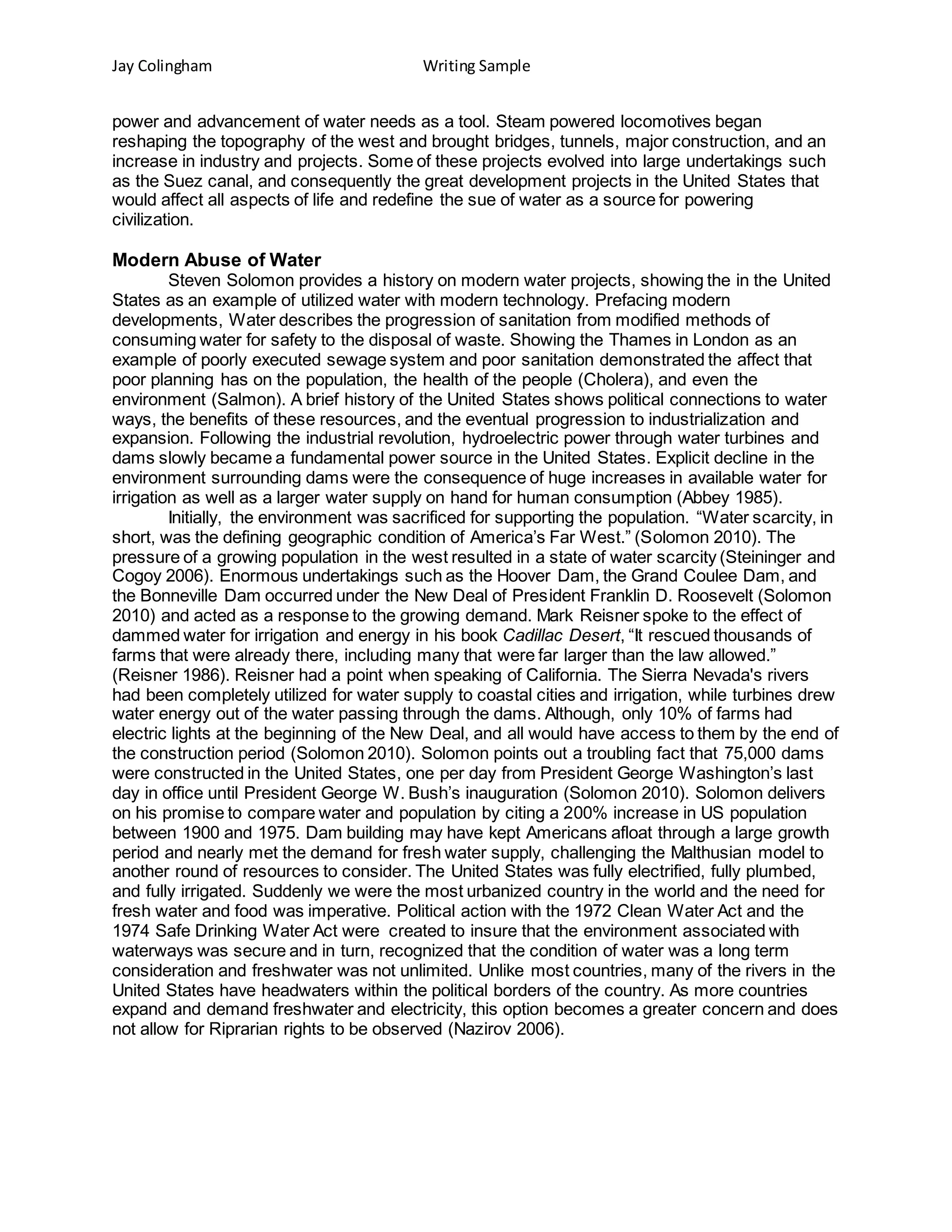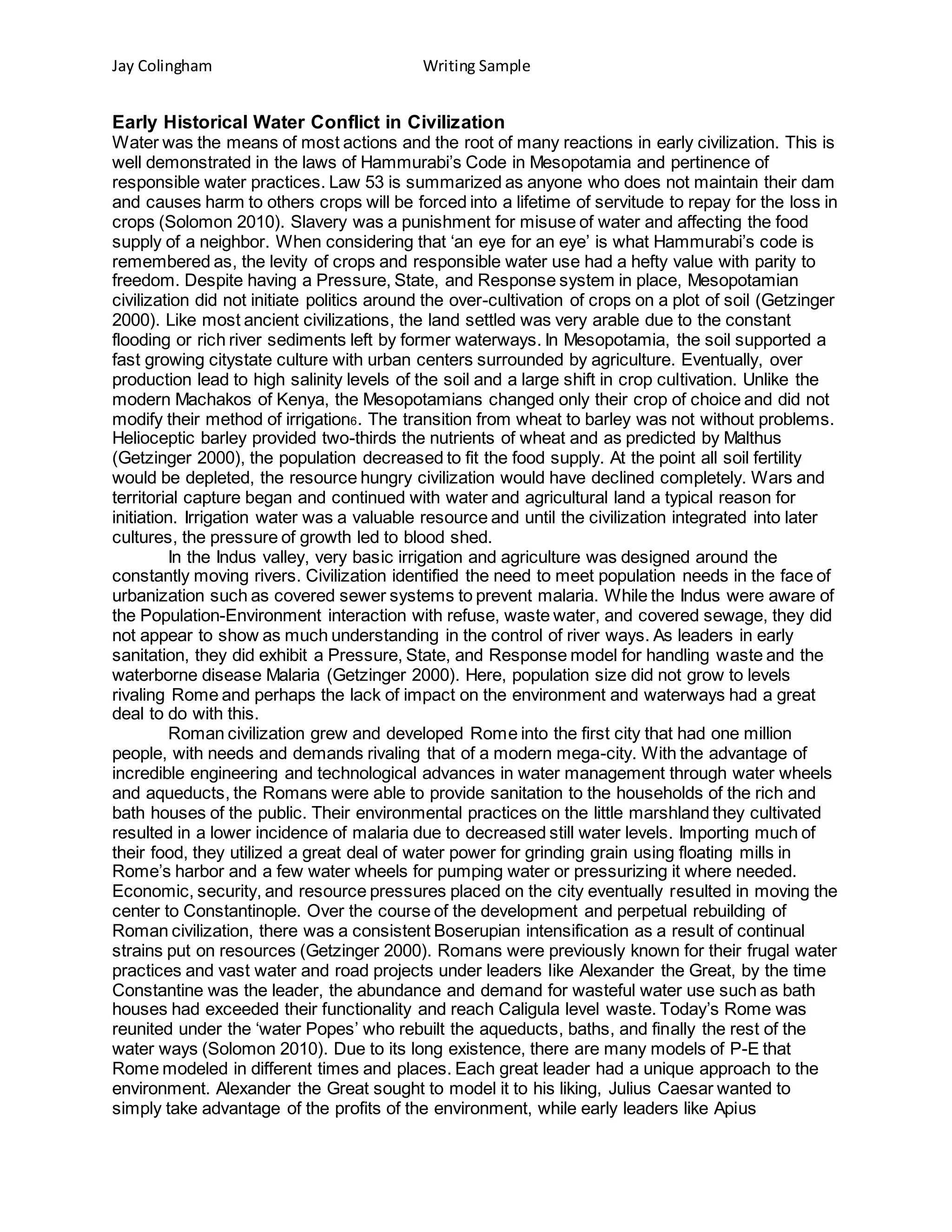 Water History in Civilization - Writing Sample - Jay Colingham | DOCX
