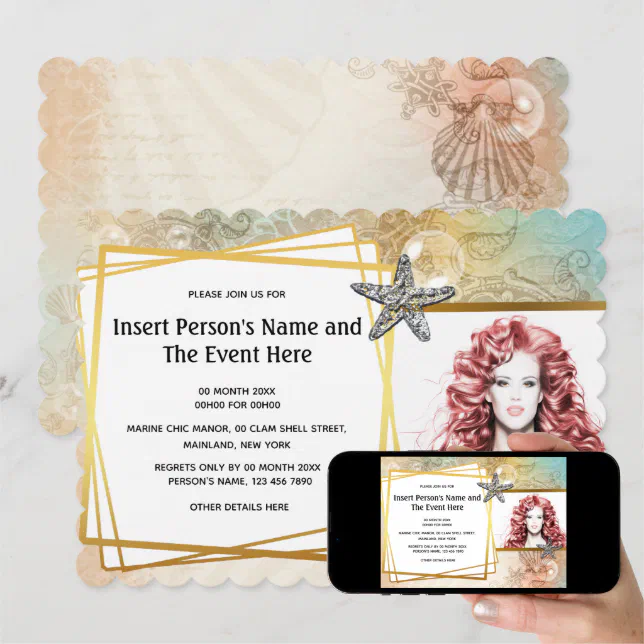 Starfish clam shell geometric gold photo party invitation | Zazzle