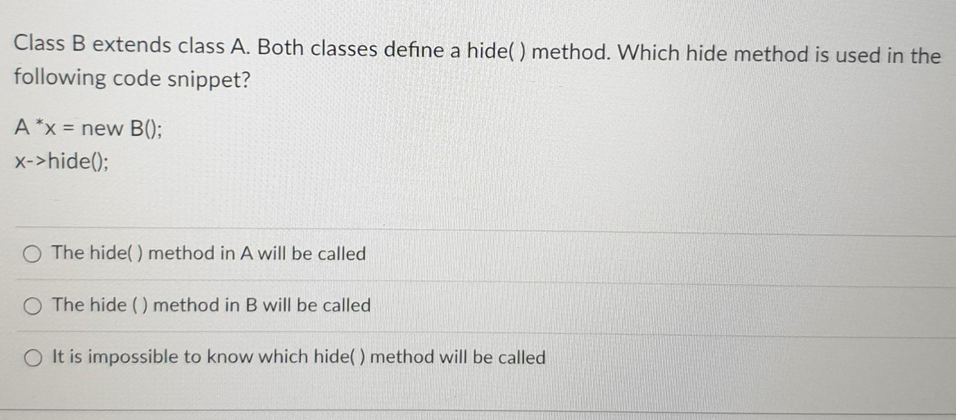 Solved Class B extends class A. Both classes define a hide() | Chegg.com