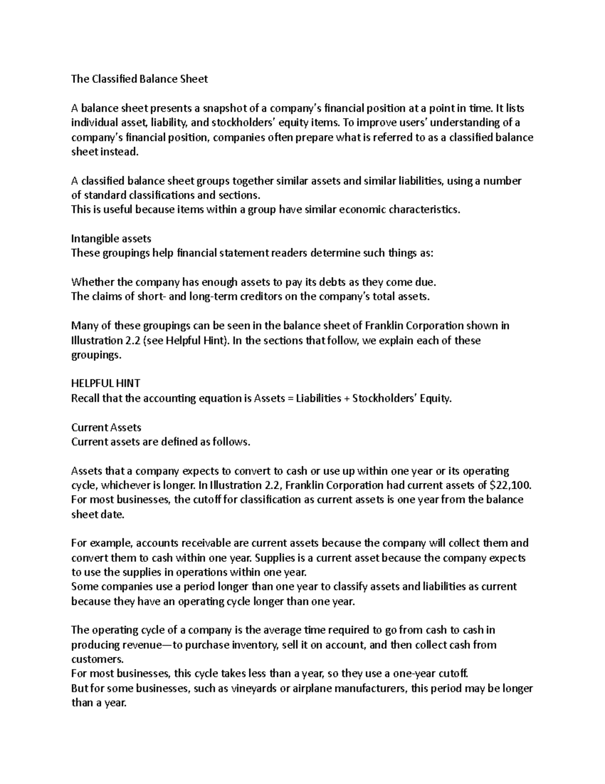 Online Chapter 2 Handout - Nature of the Classified Balance Sheet ...