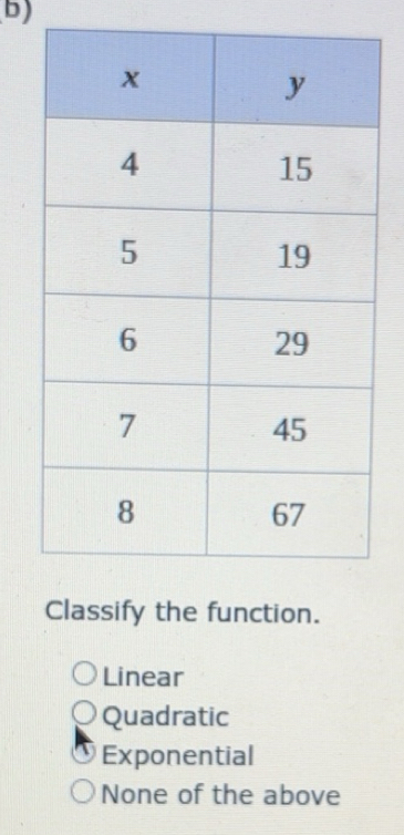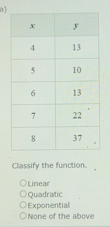 Solved: Classify the function. Linear Quadratic Exponential None of the ...