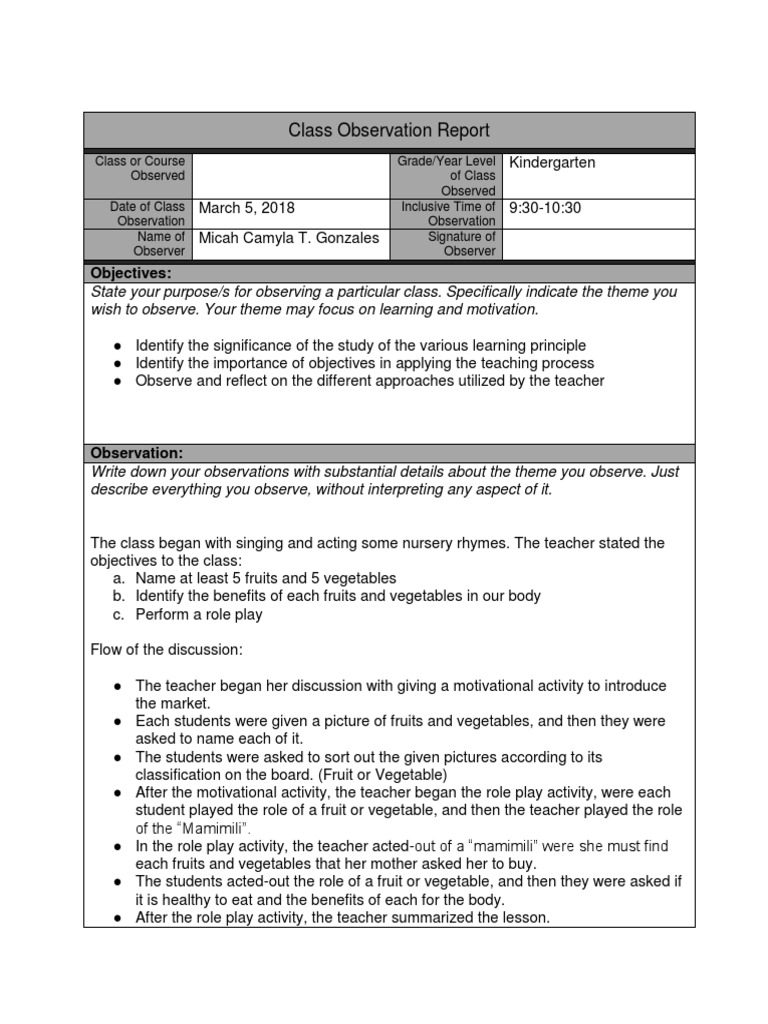 Examples Of Classroom Observation Report at Nicholas Barrallier blog
