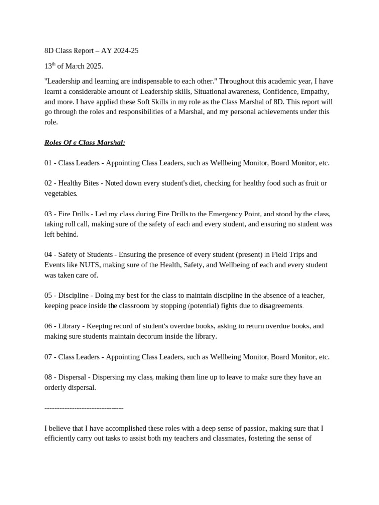 Class Report - EFK 1A | PDF