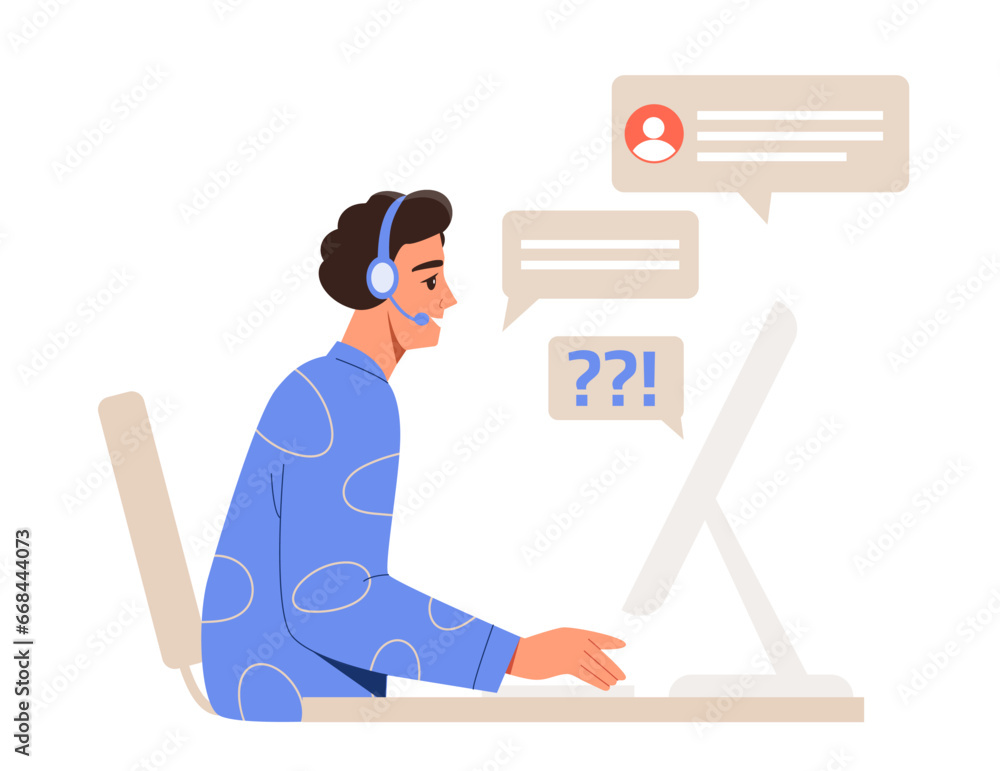 Premium Vector | Man sitting at computer typing and chatting with client