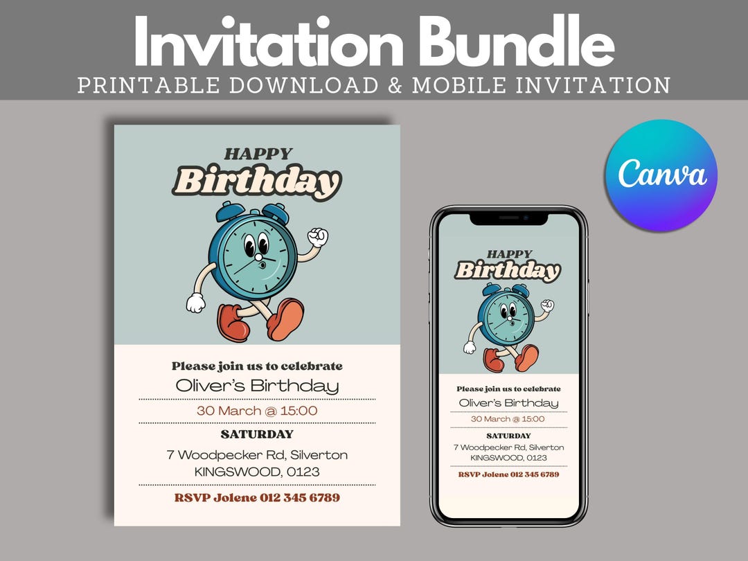 Retro Clock Invitation, Editable, CANVA, 5 X 7 Invite, Mobile Invite, E ...
