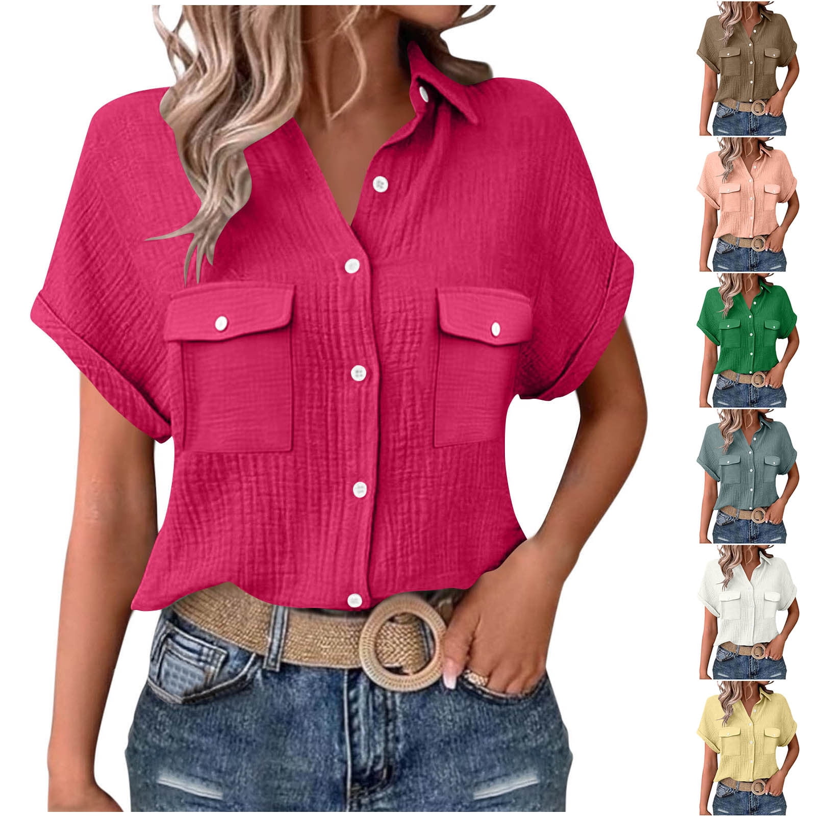 Auralook Women Solid Blouses Short Sleeve Button Down Pocket Shirts ...