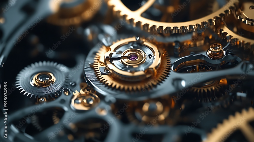 A detailed close-up of intricate clockwork gears in motion, showcasing ...