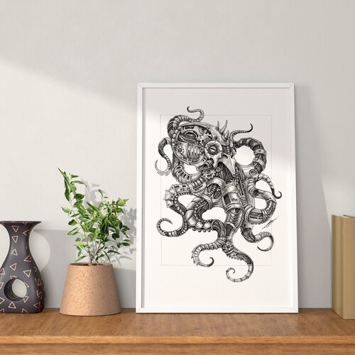 Octopus Steampunk Illustration Painting Digital Art Print, Mechanical ...