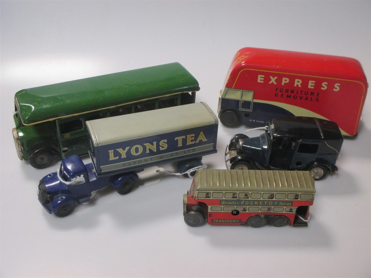 Six Tri-ang Minic tinplate clockwork vehicles, comprising pre-war 15M ...